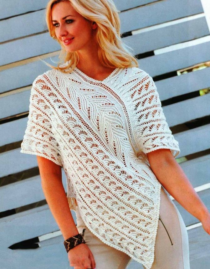Схема вязания туники может представлять собой любую геометрическую фигуру большого формата с отверстием посередине. Масштабную деталь используют в виде готовой вещи. Для удобства стороны подшивают, создавая своеобразные рукава.