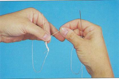 Инструмент берется правой рукой, нить – левой.