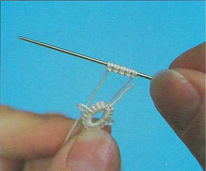 В плетении кружевных изделий кольца соединяются друг с другом. К готовому колечку наберите 5 узлов.