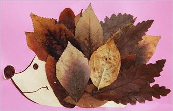 Очень распространенной поделкой из осенних листьев для детей является ежик. Для его изготовления могут быть использованы как кленовые листочки, так и листья любых других деревьев. Наверное, самым главным этапом в создании картин с помощью этой техники является правильный сбор необходимого материала: заготовку и просушку. Обычно для этого посещают парки и другие места отдыха. Листья для поделки лучше использовать недавно собранные, так как слишком сильно засушенные листья будут крошиться, и композиция получится недолговечной. Существуют две основные технологии засушки листьев: