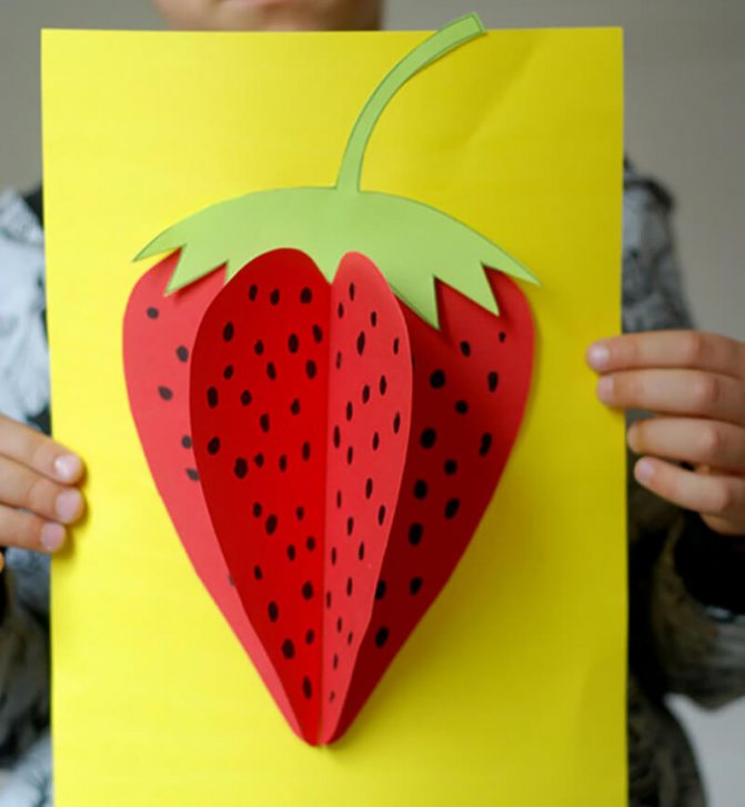 Это и будет наша клубничка. Затем одну часть приклеиваем к картону-основанию, а вторую — приклеиваем только по линии сгиба.