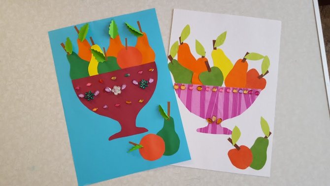 Вы можете просто вырезать нужные вам фрукты и после наклеить их вместе с ребенком в бумажную вазу. Вот так. В виде аппликации.