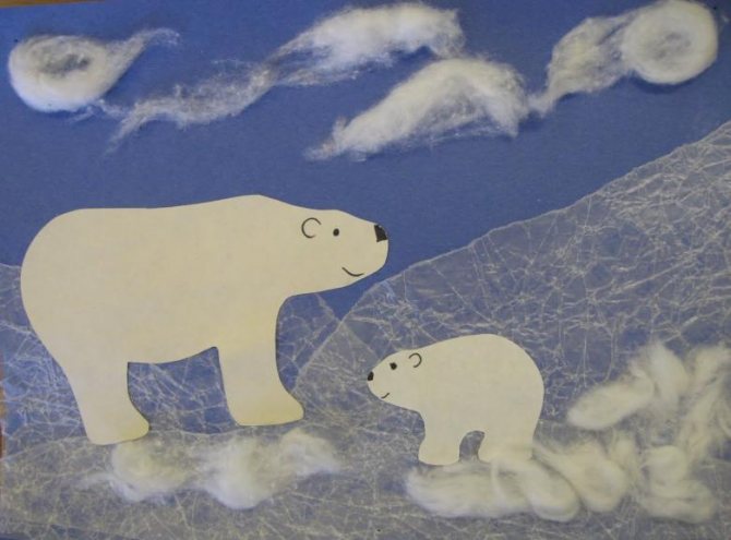 - Обрывная техника. Этот приём отлично подходит для передачи иллюзии объёма, мозаичной декоративной фактуры образа, добавляющей ему визуальной эффектности и яркости (мишкина меховая шубка, облака, ледяные глыбы и т. д.).