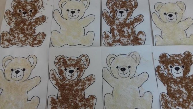 Данная аппликация осложнена тем, что деткам нужно правильно разместить глазки у зверя. Вначале занятий воспитатель должен преподнести данную информацию. Вначале дети должны наклеить мишку и насекомое, а потом должны правильно понять, куда приклеить зрачки. Воспитатель должен разместить зрачки сбоку и спросить у деток, видит ли мишка пчелу (нет), потом в другой бок и спросить также и только потом расположить глаза по центру ближе к верху. В ходе данной игры ребята смогут научиться видеть общий план картины и обращать внимание на мелкие детали.