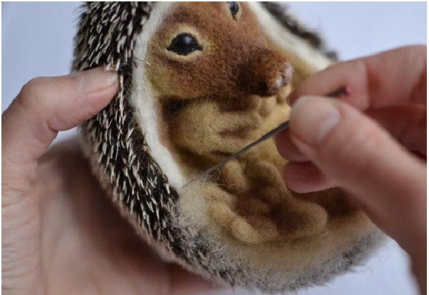 Далее начинаем использовать основную шерсть — светло-коричневого оттенка. Ею заполняем всю спинку и начинаем формировать ёжика ( так же валяем очень плотно).