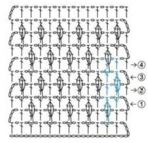 - 4 р.: 2 в. п., вяжем 1 изнан. рельефн. с. с н. в каждый ст., сс., поворачиваем.