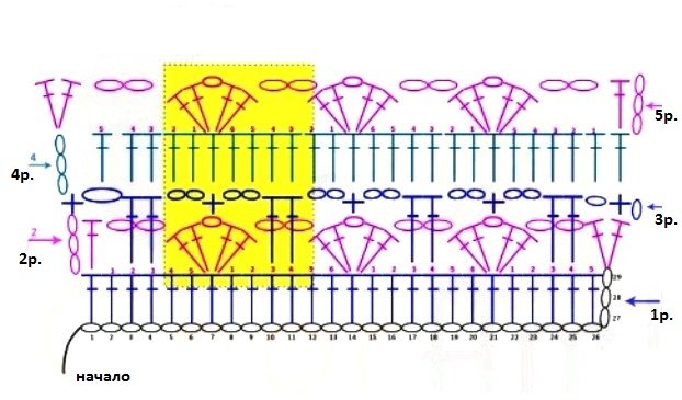 - Для формирования полотна повторяем 2-5 рр. Заканчиваем вязание 3-м или 5-м р.