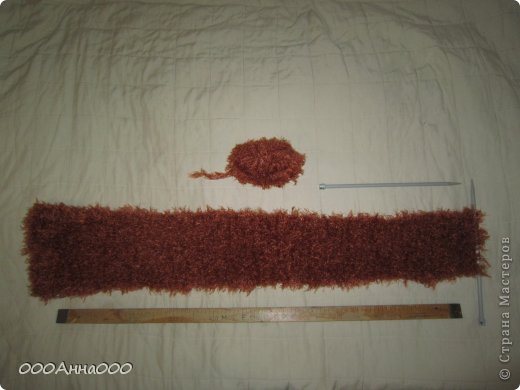 Вязала спицами 9 мм, самым простым способом (в вязании я совсем чайник), по моему, чулочная вязка называется, но это без разницы т.к. рисунка вязки совершенно не видно. Вязала очень свободно, но по другому и не получится, поскольку нитка мохнатая — основную почти не видно. Сначала переборщила с петлями, но потом сократила до 30 и почти до конца так и вязала, дальше сокращала произвольным образом. На фото изображен кусок бороды, который получился из 1 мотка пряжи, примерно 1 метр.