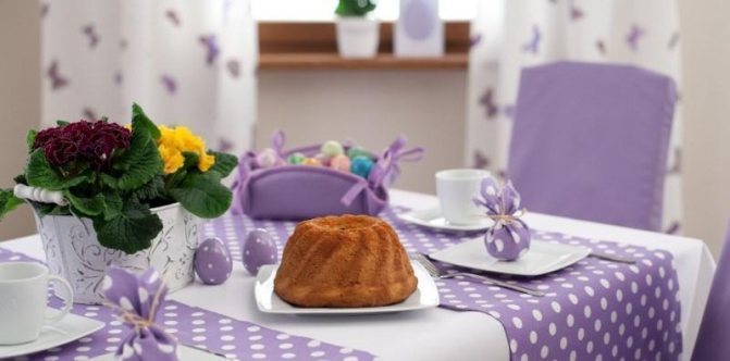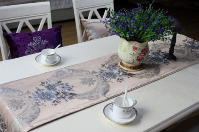 - Бегунки могут стелиться и сразу на столешницу. Но тогда во время застолья под столовые приборы следует положить салфетки-коврики для защиты столешницы от царапин и пятен. Таким образом, на дорожке стоят общие блюда, а на салфетках-подтарельниках — индивидуальные.