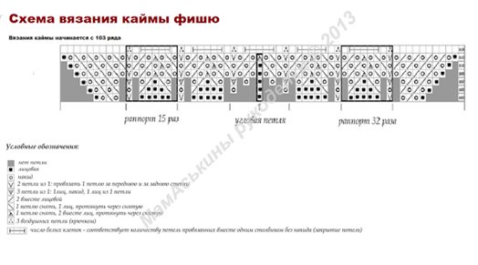 Она является не совсем обычной, но при этом ее условные обозначения помогают легко разобраться в ходе работы. Оригинальность шали Фишю заключается не только в ее своеобразной форме, но также в технике вязания спицами. Начало лежит в той точке, где находятся 5 петель, которые и будут отправным пунктом работы. Найдите это место на схеме, чтобы понимать дальнейший ход работы. Рассматривая схему и ее условные обозначения можно сделать вывод, что вязание выполняется при помощи прибавления петель. В результате количество П на спицах увеличивается, и к сотому ряду (Р) оно достигает 153 единиц. Продолжая вязание Фишю после выполнения последнего Р, необходимо работать по следующей схеме, вывязывая красивую ажурную кайму изделия. Схематическое изображение каймы также содержит условные обозначения: