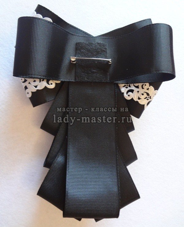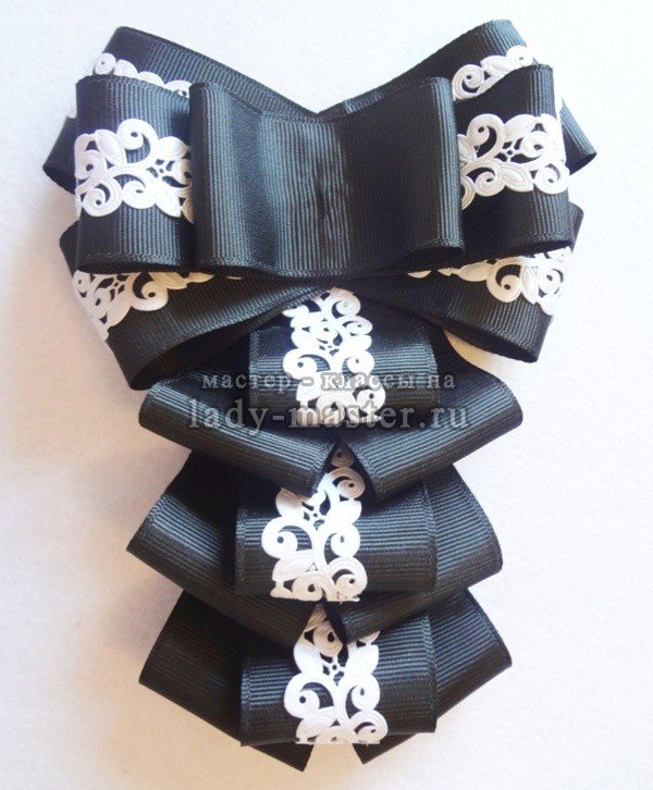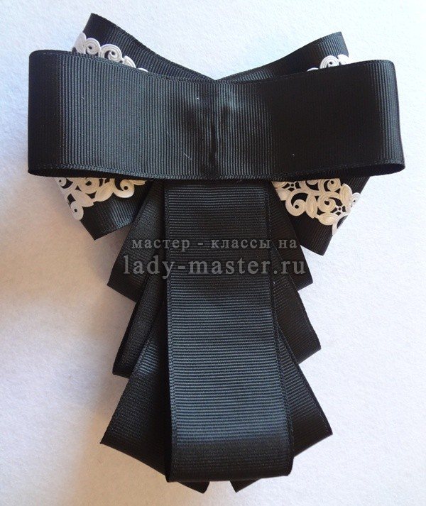 Стильное и нарядное украшение из лент готово. Его могут носить не только девочки-ученицы, но и взрослые дамы, надевая под строгий деловой костюм, т.к. такой галстук прекрасно дополняет брюки, пиджак и белую блузку.