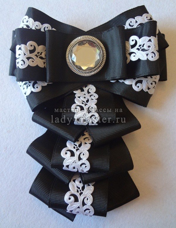 Сегодня школьные галстуки для девочек набирают все больше популярности. Такие украшения можно считать брошками. Они невероятно красиво смотрятся с черно-белой школьной формой, и сами обычно выполняются в такой же цветовой гамме. Чтобы превратить обычную белую блузку в праздничную одежду к первому или последнему звонку, достаточно просто украсить ее галстуком, наподобие такого, который приведен в этом уроке.