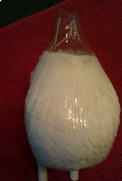2. Вырезаем из пенопласта голову голубя с клювом. Обрабатываем шпатлевкой, затем наждачной бумагой, после чего окрашиваем голову в белый цвет, а клюв – в розовый. Глаза лучше приклеить готовые, которые используются при производстве мягких игрушек. Голова приклеивается к горлышку. Теперь каркас под оперение готов.