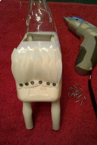 И «ляжки», и горло крепим саморезами к большой белой бутылке.