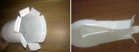 - на бутылке от моющего средства проделываем прорези, в которые впоследствии будут вставлены ноги голубя по отметке, проходящей на треть от нижнего края бутылки.