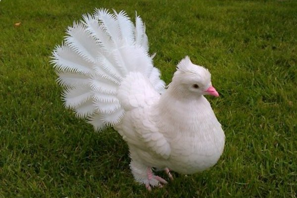 Для пушистого хвоста потребуется изготовить своими руками металлическую решетку, на которую последовательно закрепить проволокой перья. Как вариант, подойдет сетка рабица. Каркас декорируется с двух сторон. Когда хвост голубя полностью готов, его аккуратно крепят к пластиковому туловищу саморезами.