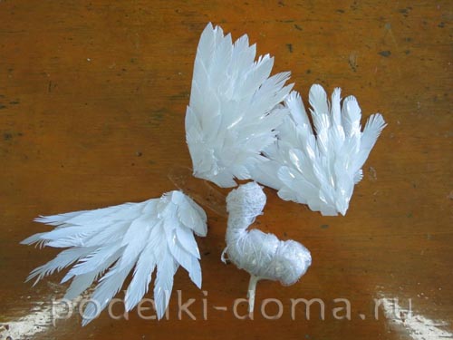 Чтобы покрывать оперением горло голубя было удобно, его на время снимают с пластикового туловища. Технология декорирования аналогична работе с пышными лапками.