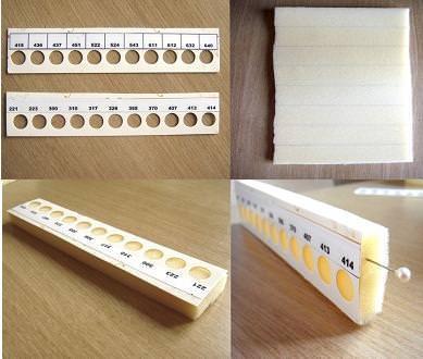Картонный органайзер для ниток нужно разрезать вдоль на две части, должно получиться две картонных полоски с 11 дырочками на каждой. Лист с распечаткой необходимо разрезать на линейки. Каждую линейку с символами (номерами) нужно наклеить на подготовленные полоски из картонного органайзера. Для того чтобы заготовка прослужила дольше времени ее можно заламинировать с помощью прозрачного скотча. Подготовленный кусок паролона нужно разрезать ножницами на прямоугольники, которые будут по размеру соответствовать картонным заготовкам. С помощью клея «Момент» нужно приклеить картонную заготовку к паролоновому кусочку. Клей требуется наносить очень внимательно, чтобы он не оказался в той части поролона, в которой расположены дырочки, иначе они зафиксируются и пользоваться органайзером не получится.