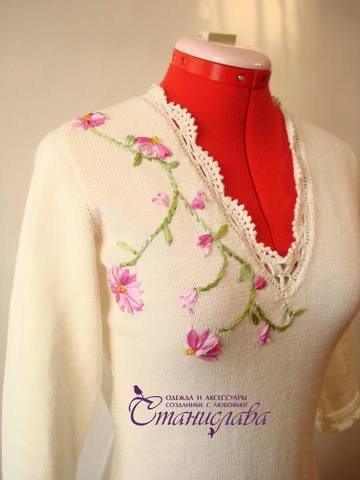 Примечательно, что оформить крючком можно не только вязанную вещь, но и изделие из ткани. Также, используя крючок в действии, вы сможете придать окраску своим старым вещам, укрепить основу растянувшейся горловины или с помощью этого инструмента придать вещи изюминку, которая станет отличительной ее чертой. Такую вещь еще долгое время можно использовать в обиходе.