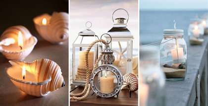 - на дно декоративной банки насыпается песок, в него вставляются приготовленные свечи, дно выкладывается ракушками.