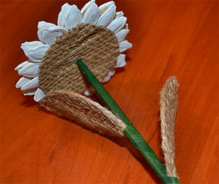 Сделаем детали из картона – круг диаметром 6 см и лепесток в высоту 7 см и длину 4 см. заготовки из картона переносим на мешковину. Кружочков нужно 3 штуки, а лепестков 6 шт. круглые детали из мешковины приклеим на обратную сторону цветочков. По краю лепестков из мешковины, приклеим джутовую нить.