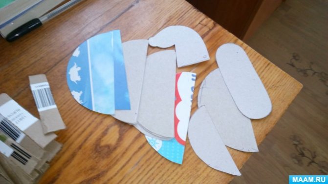 4. Склеиваем две полоски из гофрокартона и один полукруг. Затем склеиваем две такие части и между ними приклеиваем голову и хвост.
