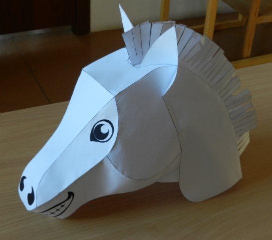 Затем наклейте готовую лошадь на чистый лист А3 и внизу оставьте место для ободка. Вырежьте лошадь из листа, оставляя внизу ободок, для крепления на голову. Как видим, маску делать просто.