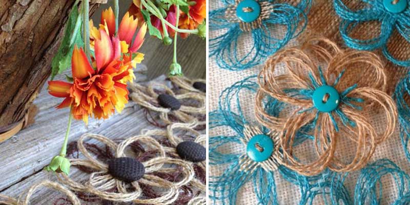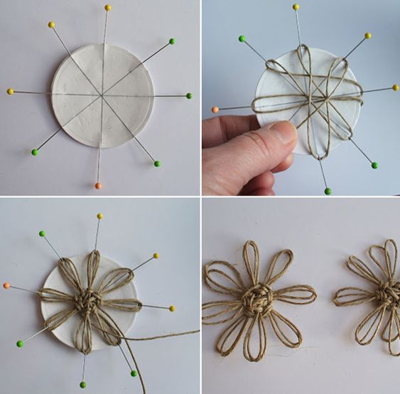 Для таких цветочков вырезаем круг из картона — основу, делаем разметку и втыкаем иголочки. Плетем, надевая петли на иголки и перекручивая их. Затем связываем у середины и декорируем пуговицей.