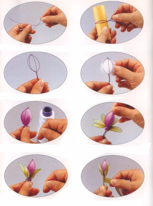 Для изготовления лепестков цветка необходимо обернуть тонкую проволоку вокруг шаблона подходящего размера. Усики проволоки соединить и завинтить с помощью плоскогубцев. Затем полученное «колечко» снять с основы и откусить кусачками лишнюю часть проволоки. Для придания нужной формы лепестку руками вытянуть полученный каркас. Аналогичным образом действовать с остальными лепестками. Следующий этап — натяжение на полученные каркасы капрона. «Вложить» лепестки в полотно, натянув его. Слегка закрутить у основания и обмотать нейлоновой нитью. Отрезать излишки ткани и проволоки.