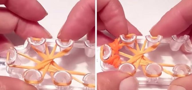 - Снимите крючком с левого столбика две нижние резинки и скиньте их в центр.