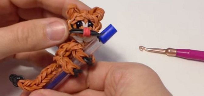 Накиньте по паре радужек для хвоста. Продолжите плести его крючком или на рогатке, чтобы он был более длинным. Сделайте лапки и скрепите их между собой, чтоб можно было надеть фигурку на карандаш.