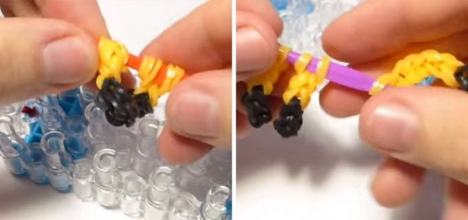 - Нижний элемент накидывается на верхний и приспускается. Плетение продолжается с тремя парами голубых резинок, после чего необходимо перекинуть правую часть на левую.