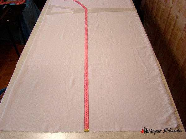 Отогните ткань на величину равную = Сб (полуобхват бедер) + 10,0 см. (на свободное облегание) + 1,5-2,0 см. (припуск по боковому шву).