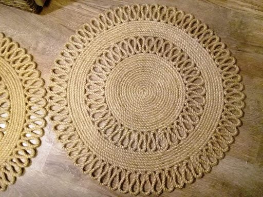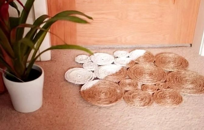 Коврик из джута своими руками можно смастерить, скручивая веревку в небольшие круги, овалы, укладывая причудливыми узорами. Детали склеивают между собой клеевым пистолетом. Создать такой коврик и даже очень большой ковер не сложно, однако, в этом способе есть минусы: очень большой расход клея. К тому же такие коврики не практичны, по ним даже ходить не рекомендуется.
