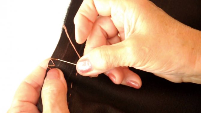 - Последний из стежков дважды повторяется на одном и том же месте, причём ткань должна быть повернута наизнанку. Игла подводится под пару-тройку последних стежков, вытягивается и перерезается ножницами.
