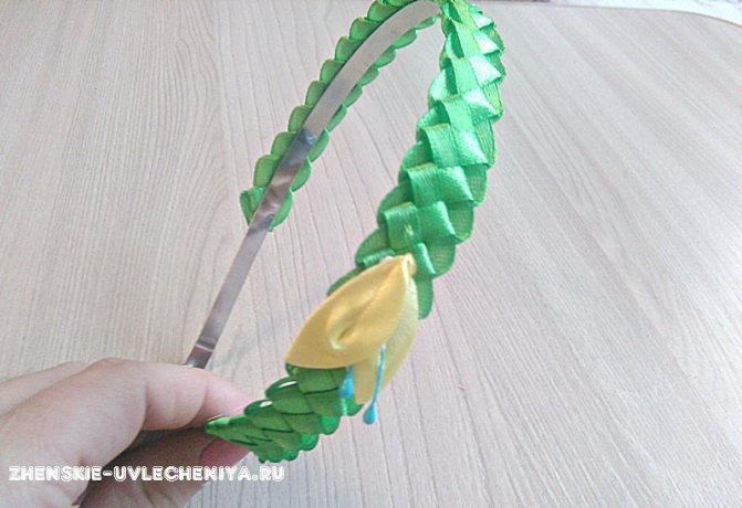 Переходите к оформлению ободка в технике канзаши, приклейте два листочка из атласной ленты.