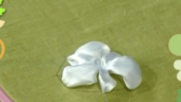 Прокалываем иголочкой в месте загиба по центру и тянем вниз ленту, не затягивая слишком лепесток: