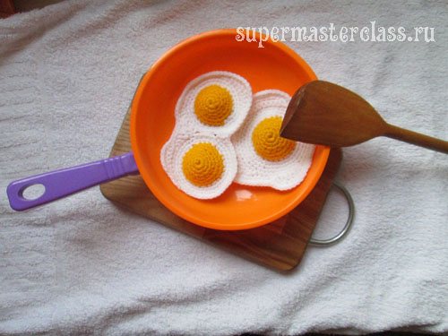 Выходом из положения может стать вязаная еда. И не только собственно овощи-фрукты, но и готовые блюда разной степени сложности исполнения. Примерном аппетитно выглядящей вязаной еды является яичница. А вязать ее более чем просто — вы в этом сейчас убедитесь.