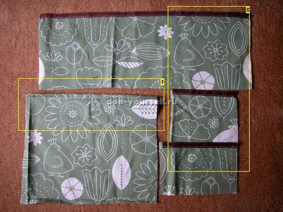 Остаток липучки пришейте к нижней части самого большого куска ткани ( 40 х 56 см), см. фотографию.