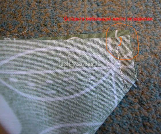 Прошейте углы, оставив небольшой кусочек в конце незашитым. См. Фотографию.
