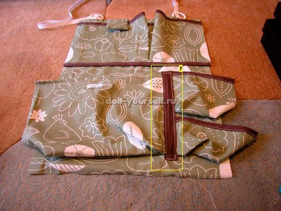Осталось оформить промежутки между карманами, возьмите кусок тесьмы и пришейте ее, чтобы прикрыть края промежутков между карманами. См. фото.