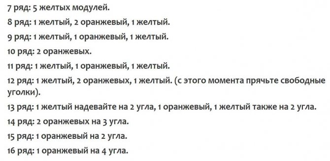 - Наберите крылья, хвост и шею петушка. Шестой ряд состоит из 31 детали: Крыло: 2 оранжевый, 1 желтый, 1 зеленый, 1 синий, 1 зеленый, 1 желтый, 2 оранжевых модуля. Второе крыло: сделайте аналогично на противоположной стороне. Первый и последний оранжевый модуль фиксируете на одном уголке треугольника. Шея: из 7 желтых. Хвост: 6 желтых. При этом останутся свободные концы между крыльями и шеей, как показано ручкой на фото ниже.