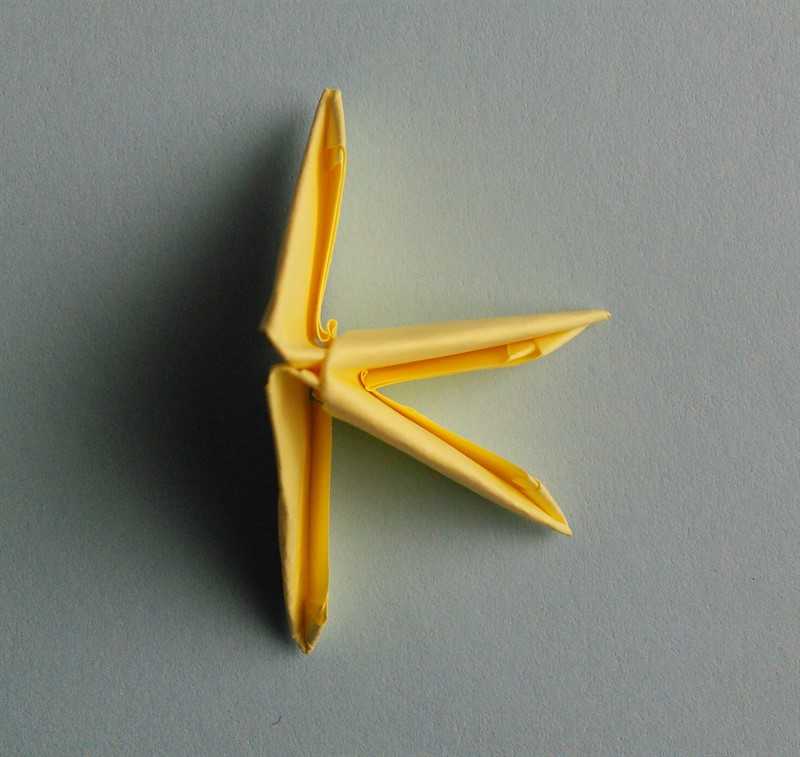 - Повторите процедуру с левой стороной изделия. Затем сложите треугольник так, чтобы он получился объемным. Модуль готов. Золотой петушок будет состоять из них.