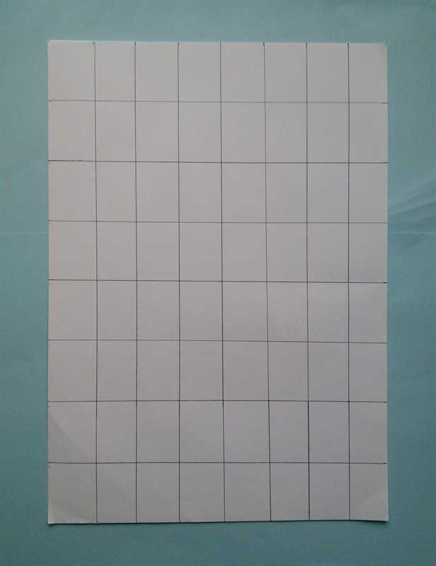 Рассмотрим, как выполнить петуха самостоятельно. Нам потребуется большое количество деталей. Для этого возьмите цветной лист бумаги формата А4, расчертите его так, чтобы он вмещал 32 одинаковых прямоугольника. Или загните пополам несколько раз, тогда заломы получатся, как на фото ниже. Аккуратно разрежьте лист по линиям сгиба ножницами.