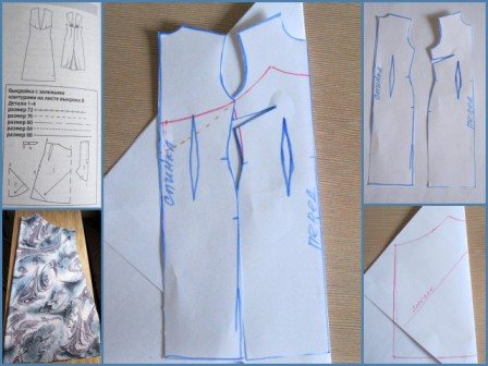 После изменений на выкройке (я делала это сразу на ткани, поэтому использую уменьшенные копии чертежа, для наглядности) нужно сложить ткань по ”косой” и наложив лекала выкроить сарафан.