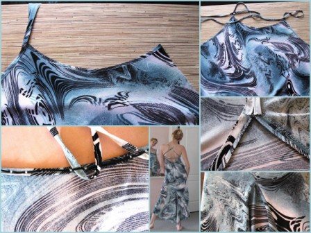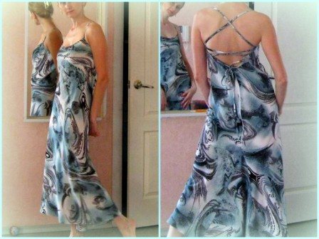 Совет, для тех, кто загорится идеей сшить подобный сарафан – выбирайте легкую, мягко драпирующуюся ткань. Крой по “косой” вытягивает любую ткань, если она будет тяжелой, то вам будет просто не комфортно в носке.