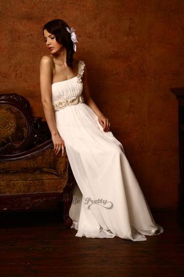 Либо можно просто сделать на одном плече струящуюся драпировку в сочетании с широким поясом на завышенной талии. При этом пояс желательно декорировать с особой роскошью, получится восхитительный наряд для невесты, как на этом фото.