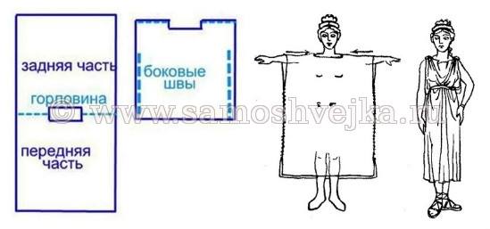 Работа по изготовлению следующая: ткань складываем пополам, вырезаем горловину на нужную нам глубину. Для получения драпировки присбориваем плечи и украшаем платье золотистыми лентами и ремешками. А можно сшить греческое платье и по такому, простому рисунку: