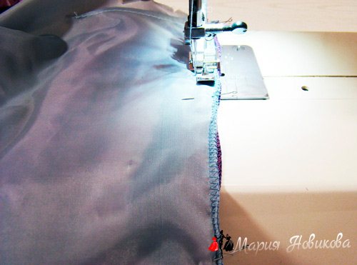 Закрепляя нижнюю часть проймы машинной строчкой.