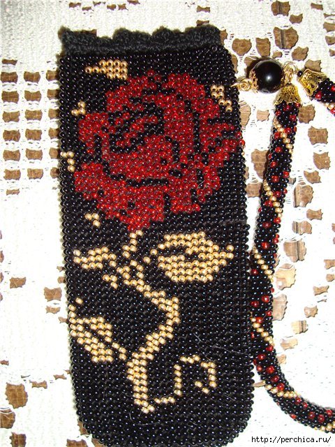 Хочу сразу дать несколько советов, чтобы вы не повторили мои ошибки, которые я успела уже сделать. 1. Нанизывая бисер в соответствии с узором, всегда делайте это читая схему в одну сторону — например справа налево, или слева направо. Иначе где-нибудь посредине чехла у вас будет неприятный сюрприз, когда ваш узор съедет непредсказуемым образом. 2. Учитывайте следующее, если при нанизывании схемы вы читаете её справа налево, то вязать вы её будете в обратно порядке слева-направо. 3. Ещё один важный момент — определите на сколько рядов вы будете сразу нанизывать бисер (я например выбрала первые 10) и начинайте нанизывать сверху вниз. Т. е. сначала по схеме 10й ряд, потом 9й, 8й и т. д. до 1го. Сразу все ряды набрать на мой взгляд просто нереально, да и ни к чему — такой длины нитку вы просто не сможете продергивать постоянно вниз. Поэтому набирайте для начала рядов на 10-20. Ну вот и всё, у меня пока нового нет. Пошла продолжать нанизывать бисер . Всем удачного начала Не забывайте показывать ваши процессы. И ещё один момент — если у вас что-то не получается — пишите пожалуйста подробно что вы делаете и что именно не получается. И прикладывайте фото вашего результата. Тогда нам дружно будет легче подсказать, что именно надо исправить. 26-01-2014 Хочу показать вам результат первого дня работы над чехлом. Вот такой он у меня сейчас (связала 24 ряда)